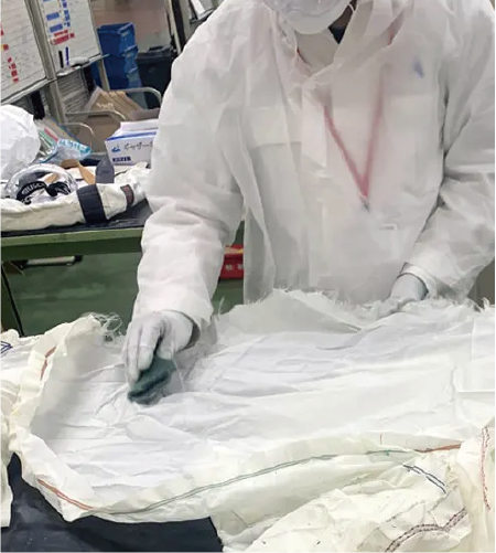 一つずつ人の手によって切り取られたエアバッグ